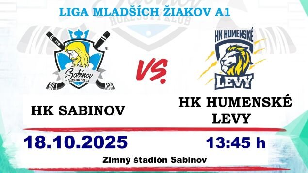 Pozývame Vás v sobotu 18.10.2025 o 13:45 hod. na Zimný štadión v Sabinove, kde mladší žiaci HK Sabinov kategória A1 odohrajú domáci zápas 7. kola Ligy mladších žiakov A1, región Východ. Na domácom ľade si zmerajú sily s rovesníkmi z HK Humenské Levy.