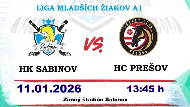 Pozývame Vás v nedeľu 11.01.2026 o 13:45 hod. na Zimný štadión v Sabinove, kde mladší žiaci HK Sabinov kategória A1 odohrajú domáci zápas Ligy mladších žiakov A1, región Východ. Na domácom ľade si zmerajú sily s rovesníkmi z HC Prešov.