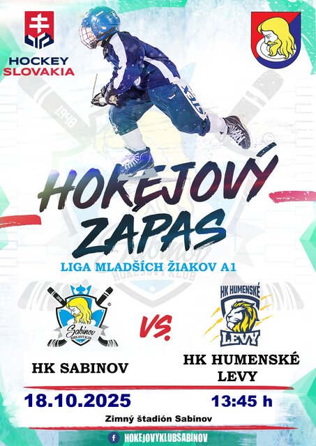 Pozývame Vás v sobotu 18.10.2025 o 13:45 hod. na Zimný štadión v Sabinove, kde mladší žiaci HK Sabinov kategória A1 odohrajú domáci zápas 7. kola Ligy mladších žiakov A1, región Východ. Na domácom ľade si zmerajú sily s rovesníkmi z HK Humenské Levy.