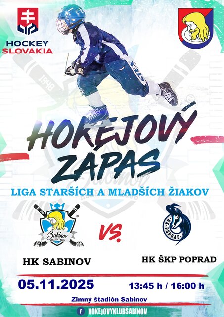 Pozývame Vás v stredu 05.11.2025 od 13:45 hod. na Zimný štadión v Sabinove, kde starší a mladší žiaci HK Sabinov odohrajú domáce zápasy 11. kola základnej časti Ligy starších a mladších žiakov A, región Východ. Na domácom ľade si zmerajú sily s rovesníkmi z HK ŠKP Poprad.