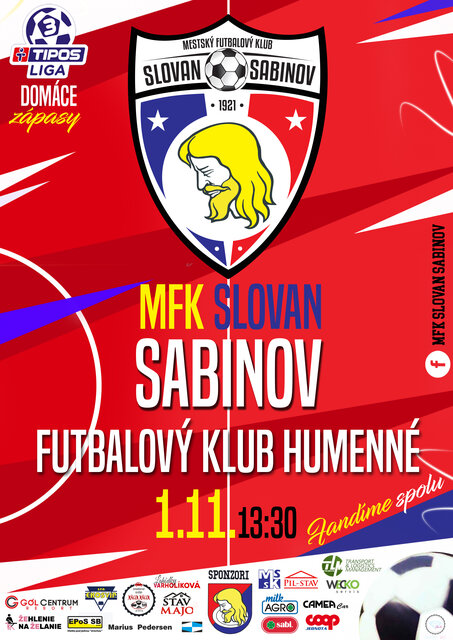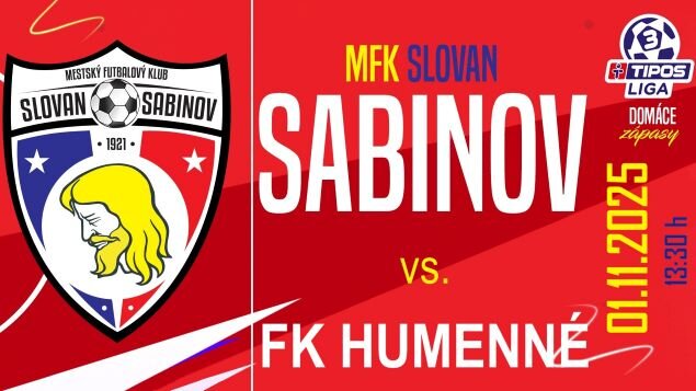 Pozývame Vás v sobotu 01.11.2025 o 13:30 h na futbalový štadión v Sabinove, kde futbalisti MFK Slovan Sabinov odohrajú posledný domáci ligový zápas jesennej časti súťaže TIPOS III.liga skupina Východ. Na domácom trávniku privítajú klub FK Humenné.