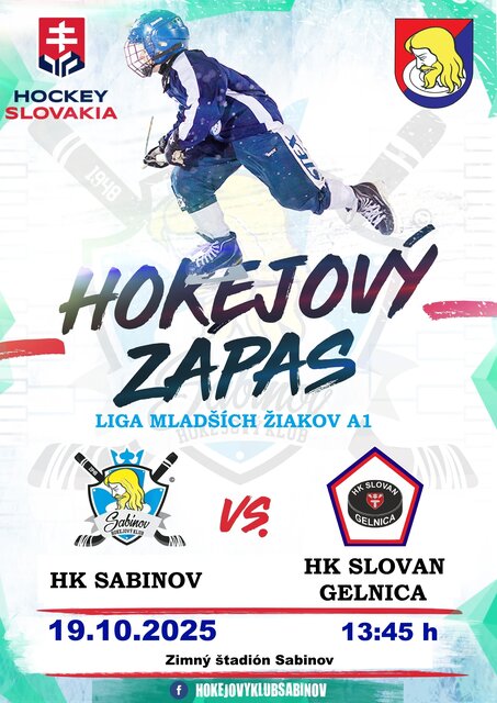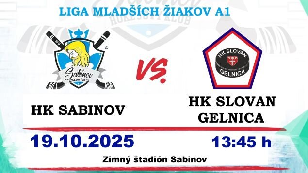 Pozývame Vás v nedeľu 19.10.2025 o 13:45 hod. na Zimný štadión v Sabinove, kde mladší žiaci HK Sabinov kategória A1 odohrajú domáci zápas 8. kola Ligy mladších žiakov A1, región Východ. Na domácom ľade si zmerajú sily s rovesníkmi z HK Slovan Gelnica..