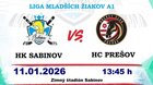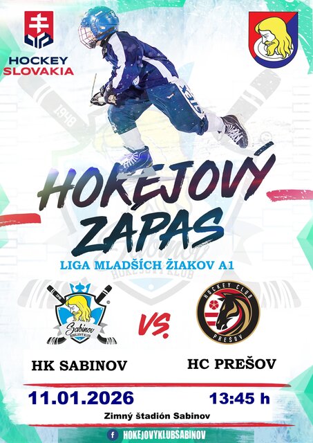 Pozývame Vás v nedeľu 11.01.2026 o 13:45 hod. na Zimný štadión v Sabinove, kde mladší žiaci HK Sabinov kategória A1 odohrajú domáci zápas Ligy mladších žiakov A1, región Východ. Na domácom ľade si zmerajú sily s rovesníkmi z HC Prešov.