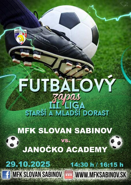 Pozývame Vás v stredu 29.10.2025 od 14:30 h na futbalový štadión v Sabinove, kde dorastenecké družstvá MFK Slovan Sabinov odohrajú domáce futbalové zápasy 3. kola nadstavbovej časti O majstra regiónu III.ligy skupina Východ. Ich súperom na domácom trávniku budú dorastenci z košickej Janočko Academy.